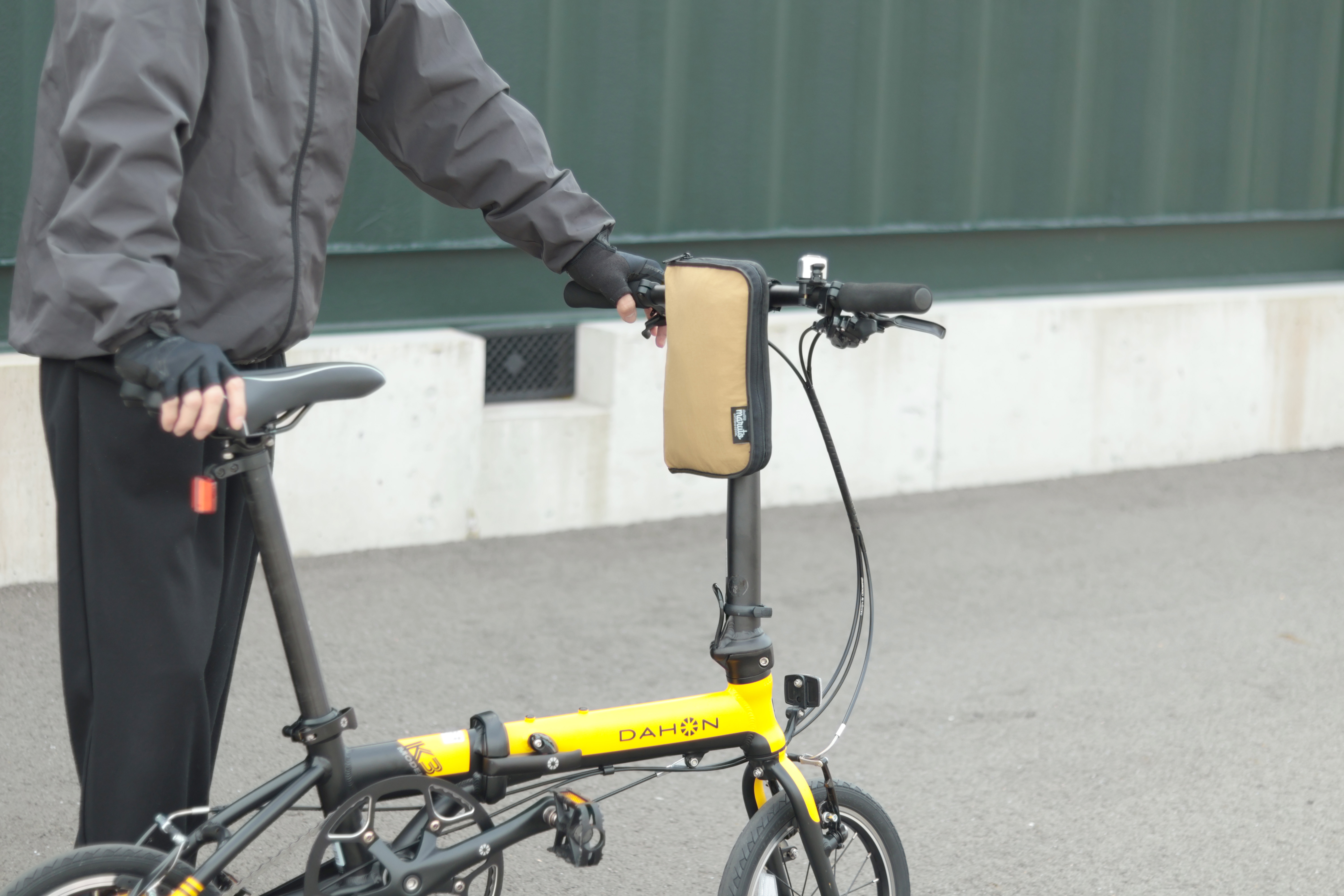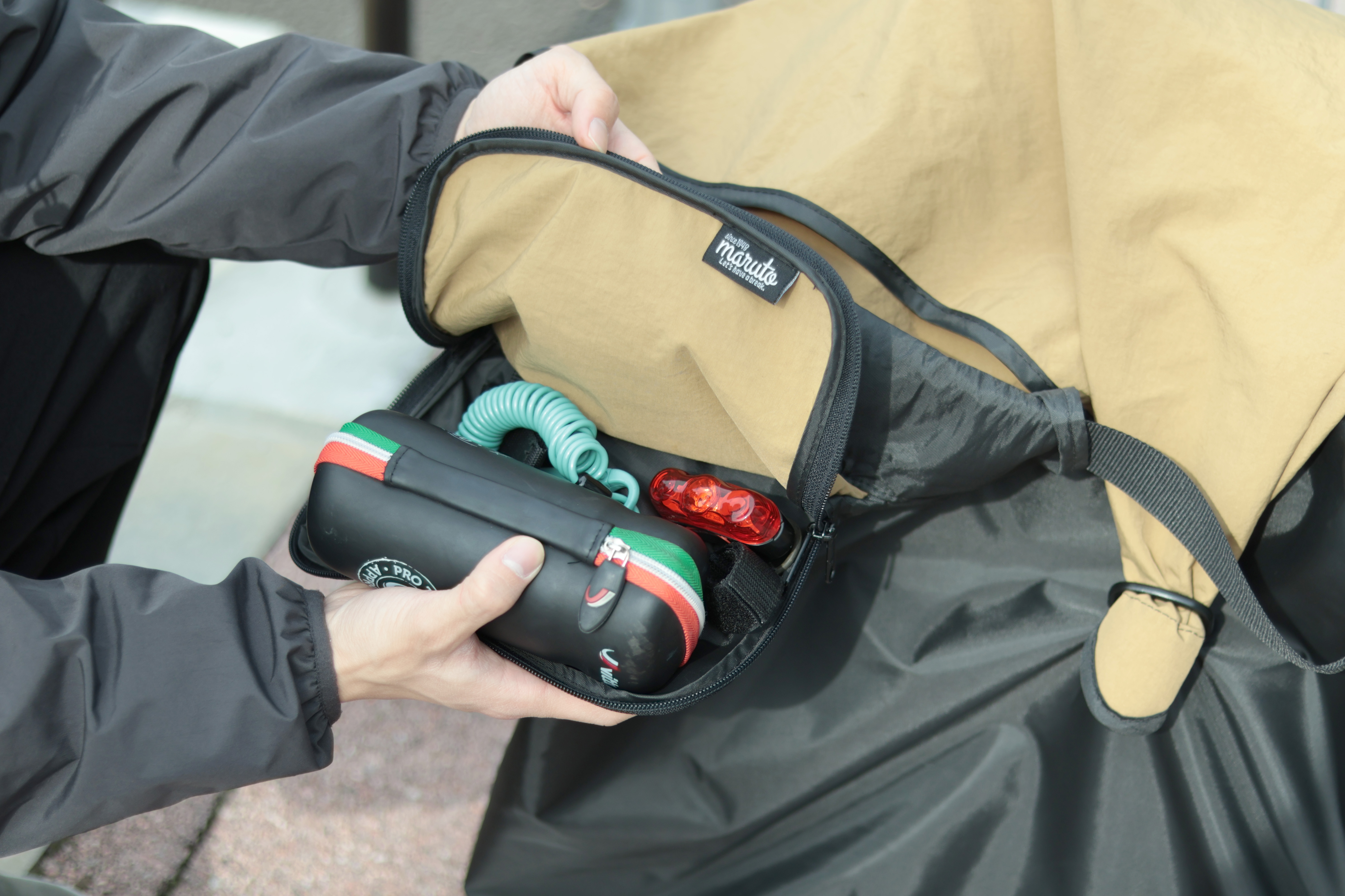 輪行中は、収納袋にワイヤーロックなどの小物を入れることができます。