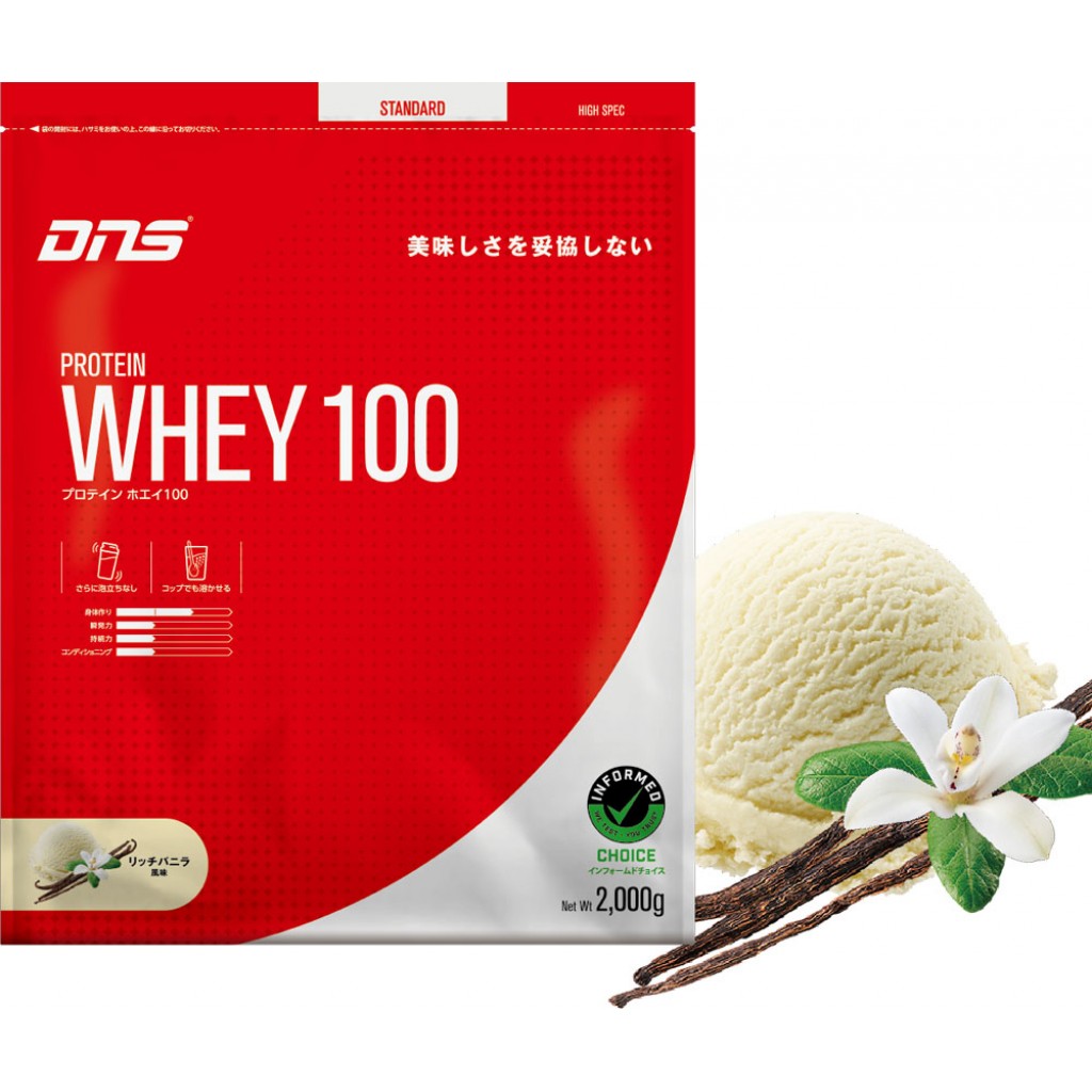 DNSは2000年の誕生以来、プロテインの味や飲みやすさにこだわってきたが、それには理由がある。理想の身体を目指すのであれば適切なトレーニングと栄養摂取は重要な要素。だが、トレーニングや栄養摂取の努力はすぐに結果がでるものではない。ゆえに「継続する」ことがカギとなる。ホエイ100は自ら進んで継続したくなるよう、美味しさ、そして飲みやすさに特にこだわった。泡立ちを減らし「飲み物として美味しい」を目指したプロテイン。プロテインとして美味しいではなく、飲み物として美味しいを目指し、毎日でも飲みたくなるフレーバーを追求。そして、DNSのこれまでの技術の蓄積からシェイク時の泡立ちと溶けやすさをさらに改良し、泡立ちはほぼなし。様々なシーンでも採り入れられるよう、コップに水を入れてかき混ぜるだけで溶かせる溶けやすさを追求。プロテインを飲むストレスをゼロにすることを目指した。DNSはスポーツサプリメントメーカーとして、アンチ・ドーピングの精神に賛同。2016年からは、英国LGC社が運営する「インフォームドチョイス」というアンチ・ドーピング認証プログラムを取得している。そのため、あらゆるアスリートが安心して飲むことができる。理想の身体を得るため、美味しさに妥協のないホエイ100をぜひ活用して欲しい。