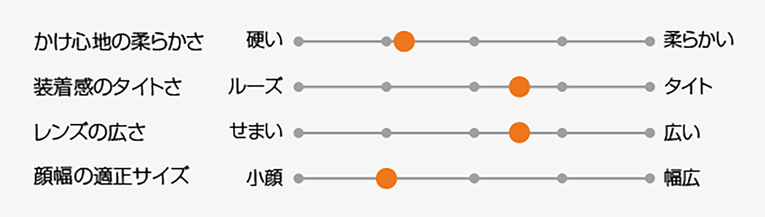フレーム/TR90、スクリュー/ステンレス、サイドパッド芯/チタン、テンプル芯/ステンレス、レンズ/ポリカーポネート、ラバー/エラストマー