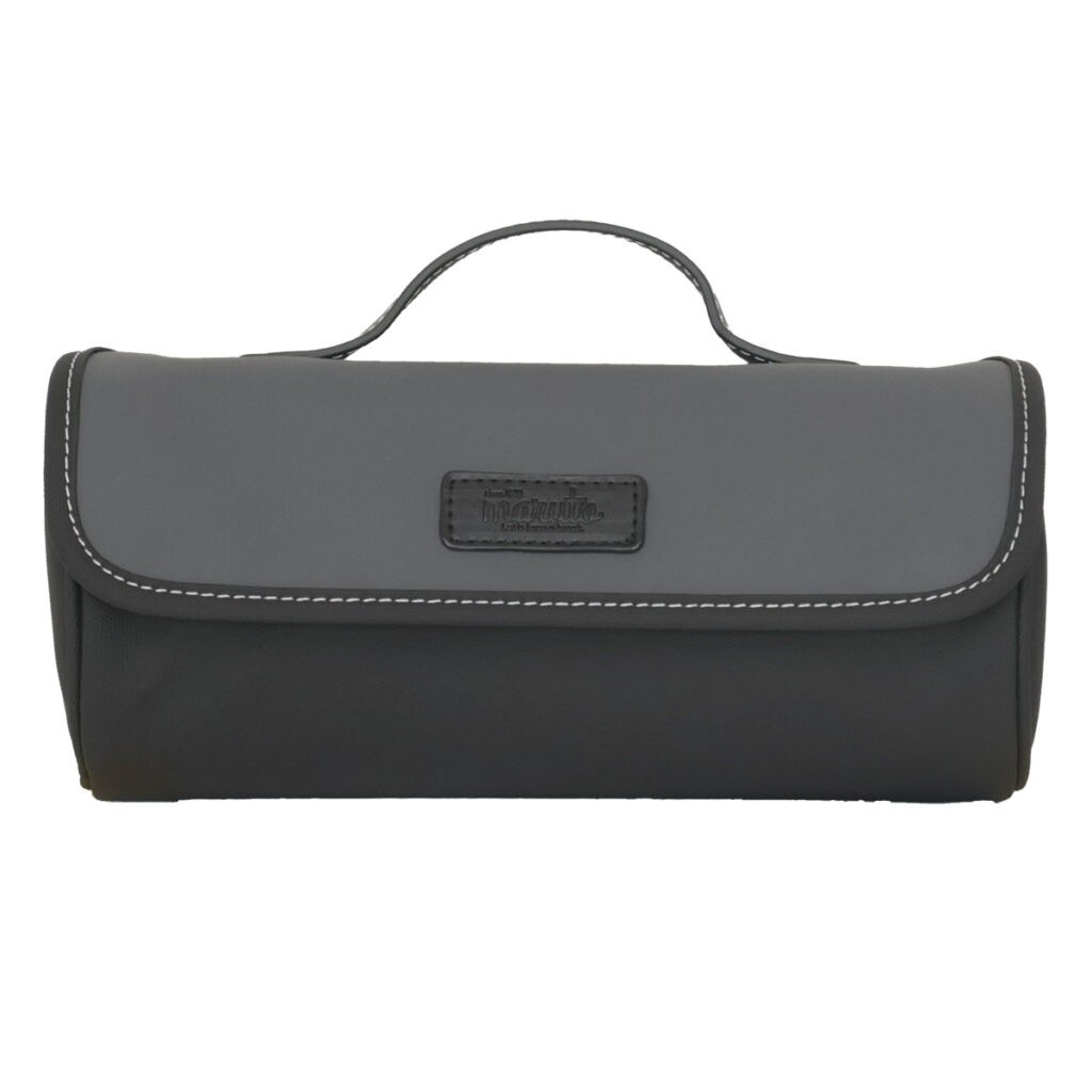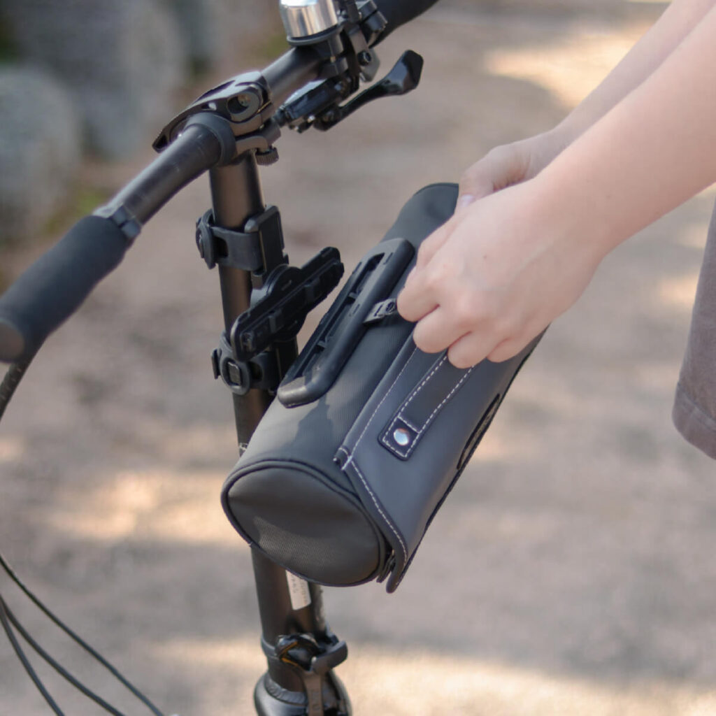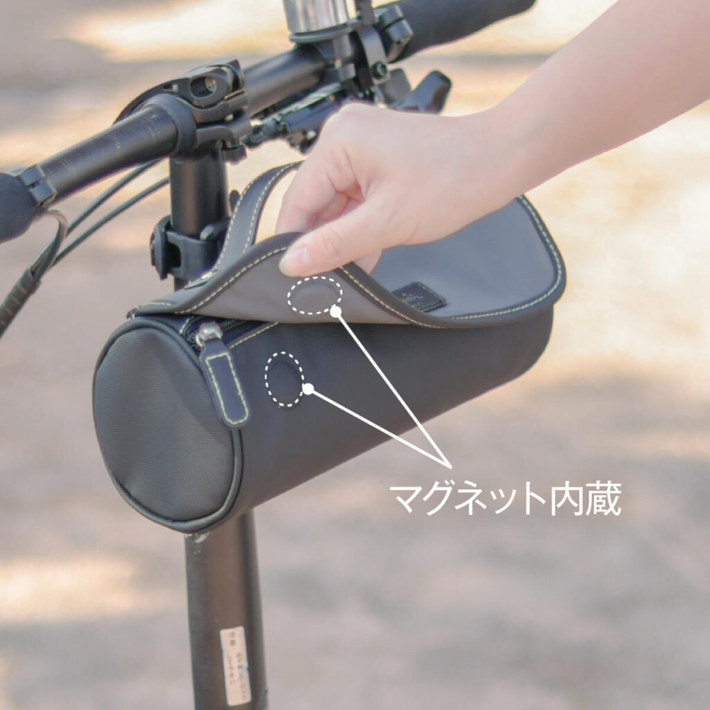 留め具レスで開け閉めがラクラク。さらに、開口部はファスナー付きで走行中の中身の落下も防ぎます。