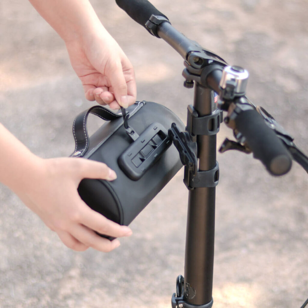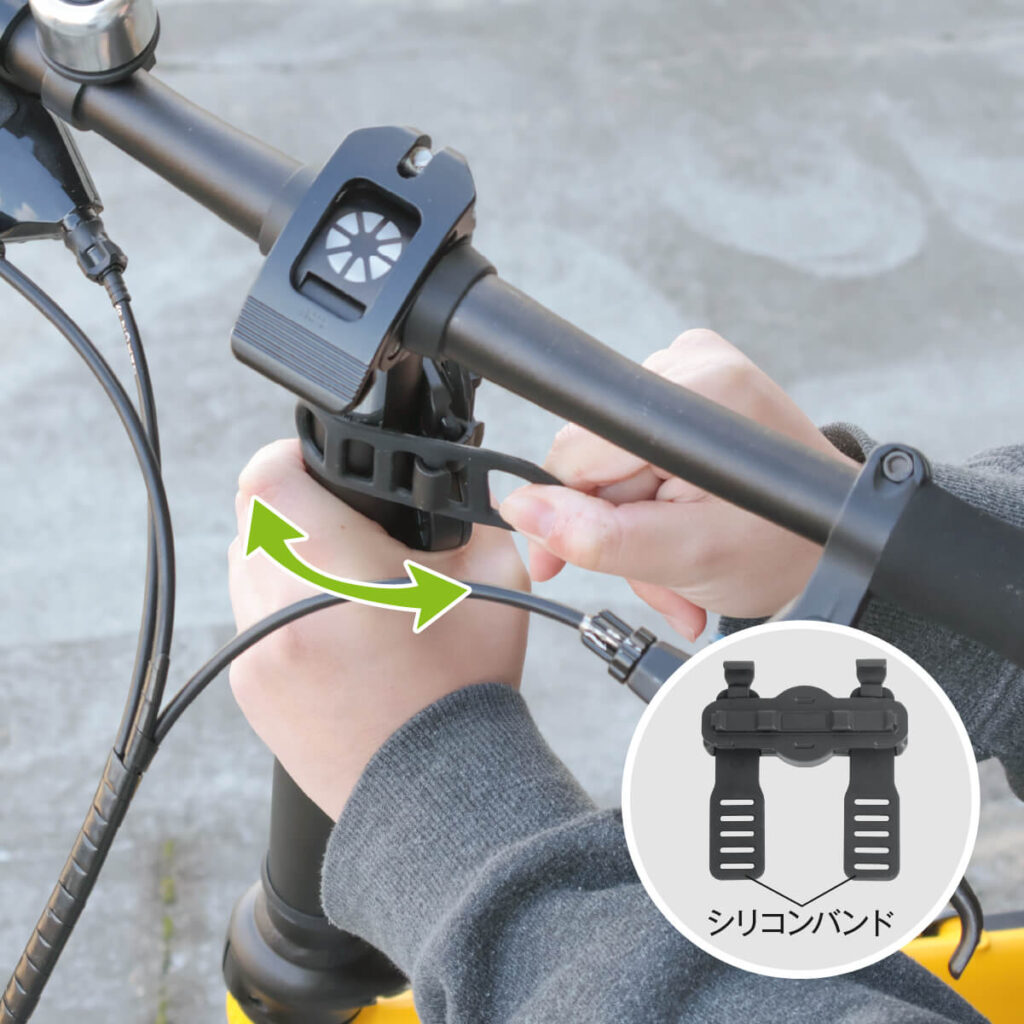 自転車フレームのお好みの場所に取り付けられます。シリコンバンドが伸縮し、しっかりとフレームに巻き付けることができます。