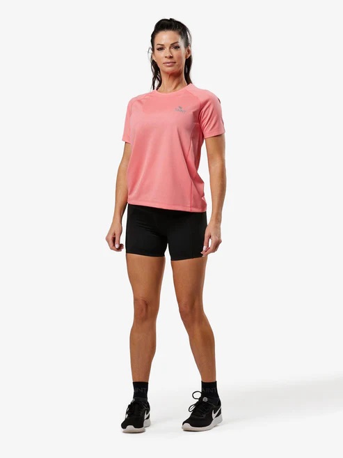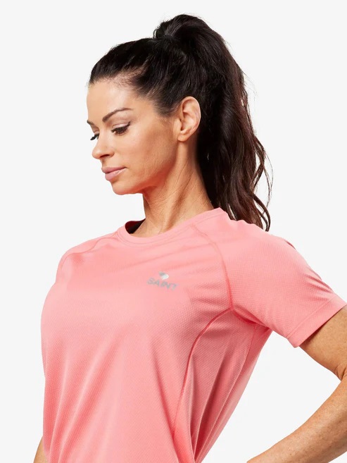 ランニング中も涼しくドライな着心地をキープする、軽量で高機能なピンクのTシャツ。